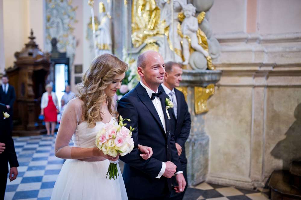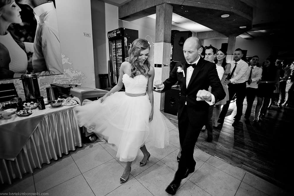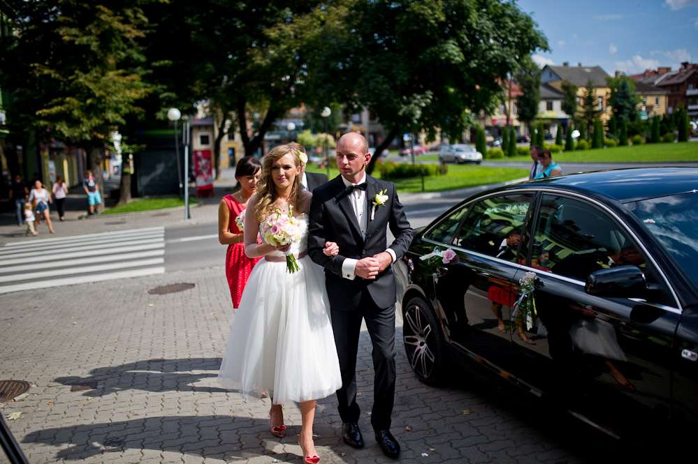 radosna opowiada o sukni zamówionej w Warszawie, o wystrzałowych butach a przyszły mąż Karol, jak to facet, z lekką obojętnością przysłuchuje się naszej pogawędce. Para z tych, które lubi się od pierwszych chwil. Ona zaangażowana w każdy szczegół, On z boku trzymający rękę na pulsie. Gentelman w pełni tego słowa znaczeniu - w dniu ślubu pyta nas kilka razy czy w czymś nam pomóc. Uśmiechnięty pojawia się na sali, bez cienia nerwów... a Panna Młoda wygląda przepięknie !